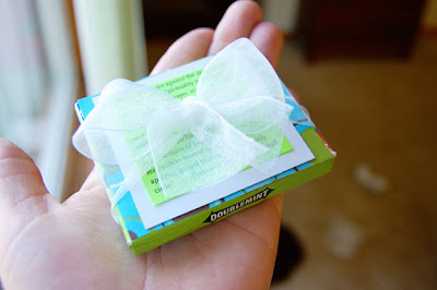 You can see the scripture on the back of the wrapper. I then put all the sticks of gum back in the package, and made a pretty label with the quote by President Kimball adhered to the front.