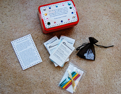 Inside the box I put a complete set of scripture mastery cards ($1.00 for all 4 sets of cards from the standard works ordered through the distribution center). I thought going through the scripture mastery cards, marking them in our scriptures, and playing some games with them would be a fun way to teach our families to treasure the scriptures.