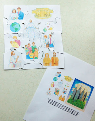 The flip side of the puzzle has different things that have to do with the temple, such as sealings, baptisms, families, the creation, and the atonement. I printed a small version of the puzzle on a separate piece of paper and cut and pasted this underneath: