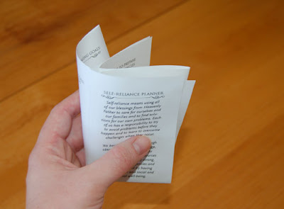 Crease everything down, and you have a nice little book to jot down a few ideas for becoming more self-reliant in all the areas mentioned in the visiting teaching message. (I make blank books like these all the time for my kids to draw in – they are lots of fun!)