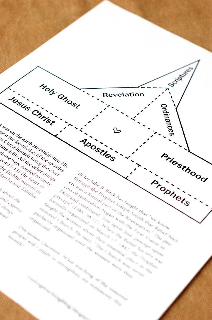 The Visiting Teaching message for February is about “The Restoration of all Things”. It talks about the restoration of the Church, and the essential place of Relief Society therein. For my lesson I altered a drawing of a church from last year’s Primary Outline for Sharing Time. It is a lesson aid to help talk about Christ’s primitive Church, the Apostasy, and the Restoration of the Gospel. The only detail I changed from the original drawing is the heart in the center. It represents the faithful women in the ancient Church like Mary, Martha and Tabitha (all mentioned in this month’s VT message).