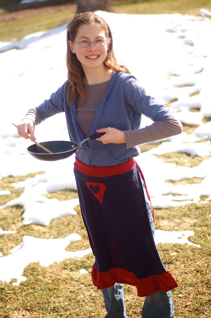 When Amy G. commented on how fun it would be to give an actual cape to the sisters we visit teach, it got me thinking. Why not create a cape that serves as a mild-mannered apron one moment, then changes to a feisty playful super cape the next?