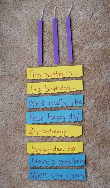 Our birthday songs that we sing each week were starting to feel a little tired, so I made a little cake to help us learn “Your Happy Birthday” (CS 283). Each line is supposed to look like a layer of frosted cake. The candle wicks are just pieces of yarn I taped to the strips of paper.
